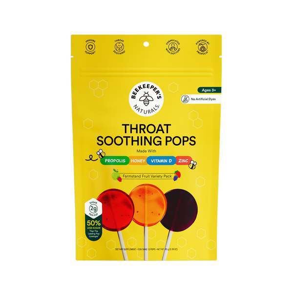 Yellow package of Beekeeper's Naturals Throat Soothing Pops on a white background Packaging of Beekeeper's Naturals throat soothing pops with a yellow background