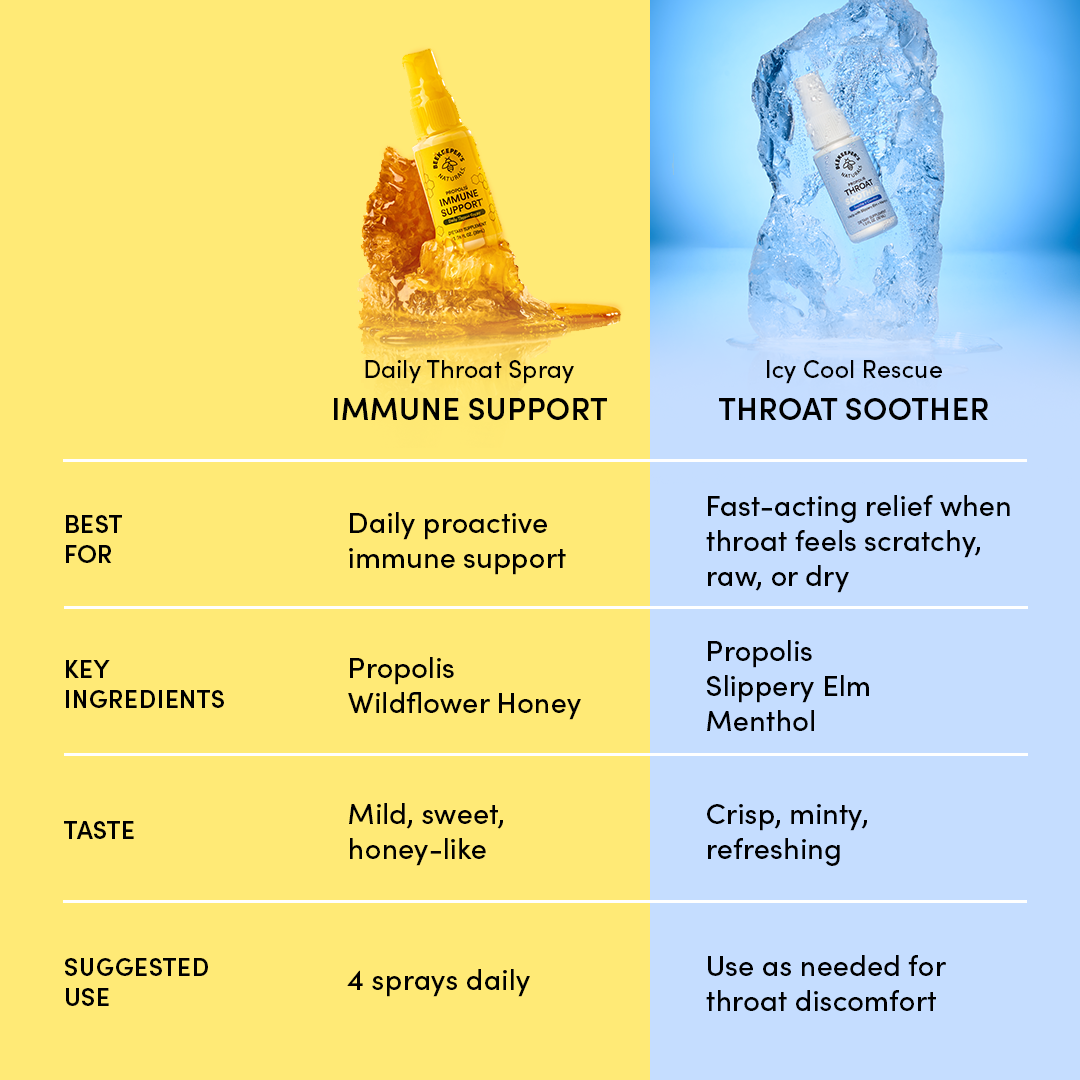 Propolis Immune Support Spray is your daily immune support, while Propolis Throat Soother is your on-call relief when swallowing feels like sandpaper.