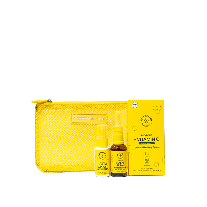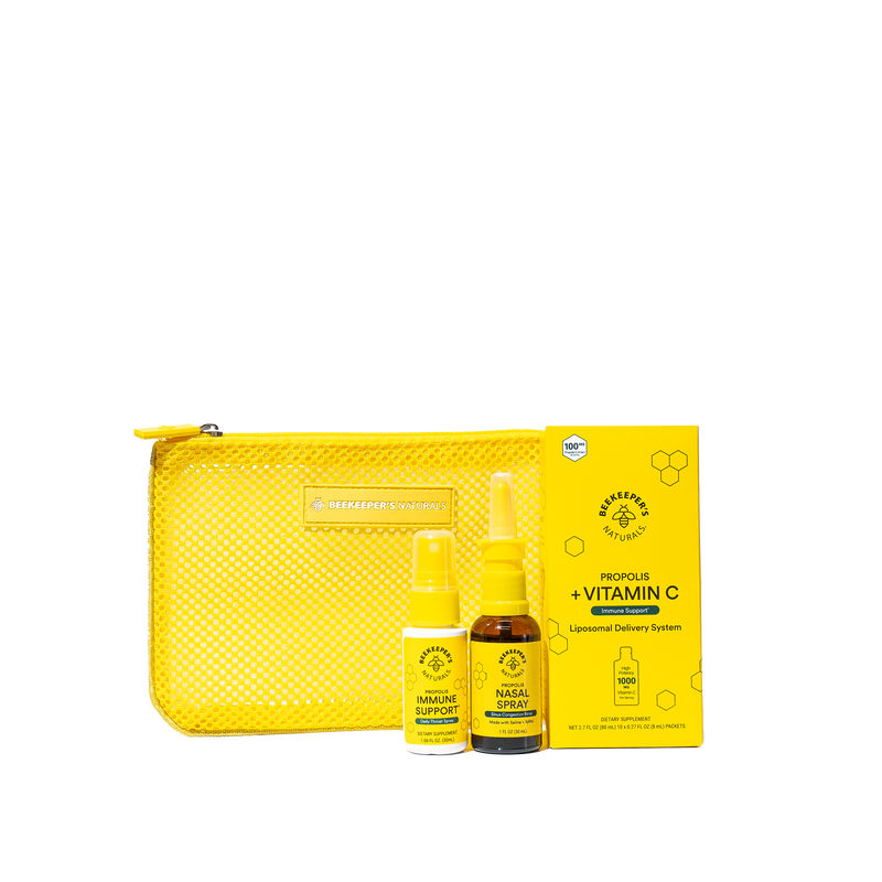 Designed to support your immune system through every leg of your journey, the Adult Travel Kit includes our Propolis Throat Spray, Liposomal Vitamin C (12-pack), and congestion-clearing Nasal Spray.