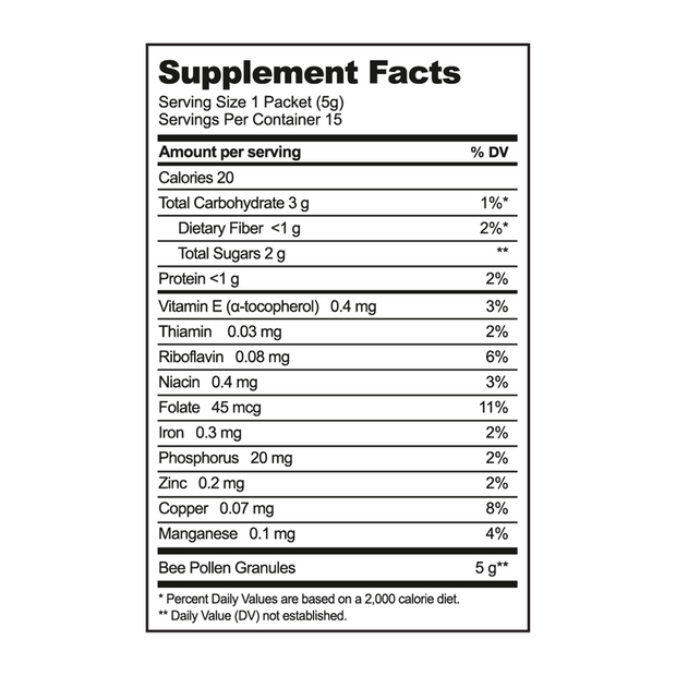 • Bee pollen single-serving packet. Nature's multivitamin packed with B vitamins, minerals, and antioxidants for energy and
