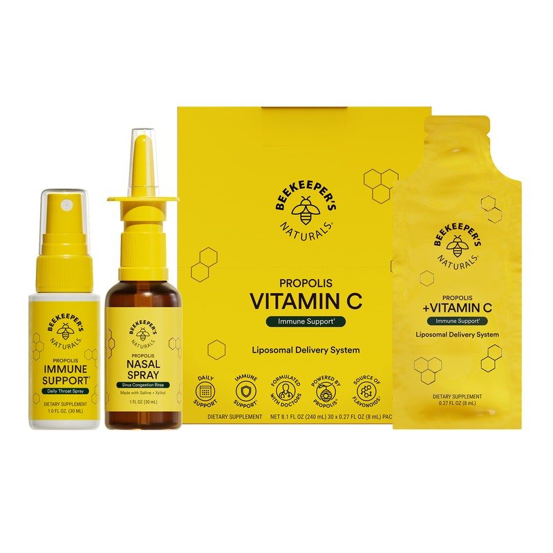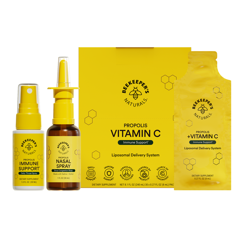 This bundle includes: Propolis Immune Support Spray (30mL), Vitamin C + Propolis Liposomal (30pk), Propolis Nasal Spray (30mL)