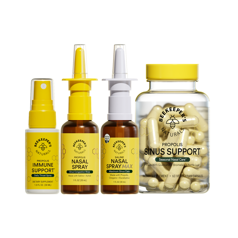 This bundle includes: Sinus Support (30 day supply), Propolis Nasal Spray (30mL), Saline Nasal Spray Max (30mL), Propolis Immune Support Throat Spray (30mL)