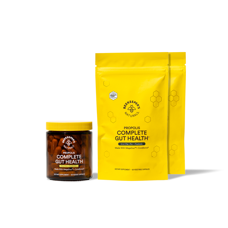 Our proprietary 3-in-1 formula delivers pre-, pro-, and postbiotics to support the growth of good gut bacteria, increase microbiome diversity, and strengthen the gut lining for whole-body health. Each dose contains Propolis, Tributyrin, and two probiotic strains— Bacillus Coagulans SC 208 and Bacillus Subtilis HU58— to promote digestive regularity and fortify immune response.