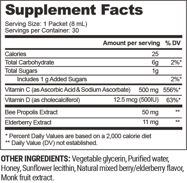 Our supercharged immune support is now gentle enough for kids. Each convenient and delicious packet delivers a powerful blend of Propolis, 500mg of Vitamin C, Vitamin D, and Elderberry to support kids' immune systems for every adventure. The liposomal formula optimizes absorption, so every drop works as hard as they play.