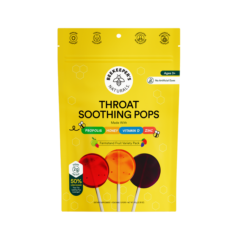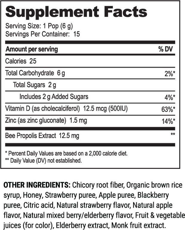 We’ve combined the immune-supporting power of propolis, vitamin D, and zinc into a delicious lollipop with only 2g of sugar and no artificial dyes or flavors. Includes 3 flavors: strawberry, green apple, and mixed berry with elderberry.